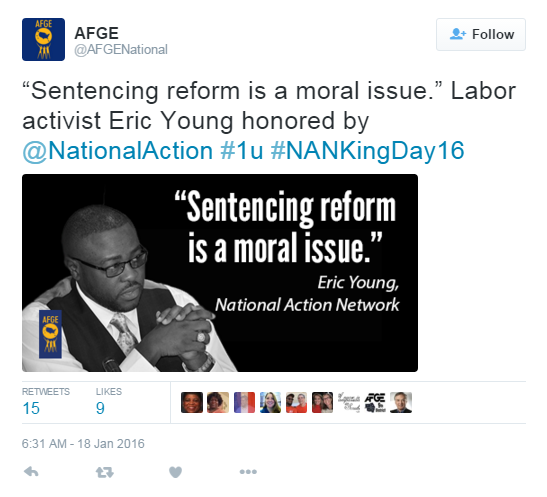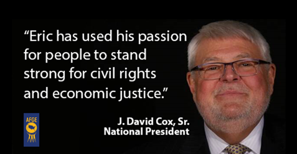 "The first-hand knowledge and advocacy of Eric, along with thousands of Council of Prison Locals members, are a much-needed perspective in the conversation around sentencing reform," said AFGE National President J. David Cox, Sr. "All workers have a stake in expanding civil rights, as workers' rights are civil rights. Eric is a shining example of how integral that relationship is to meaningful reform and a more just society."